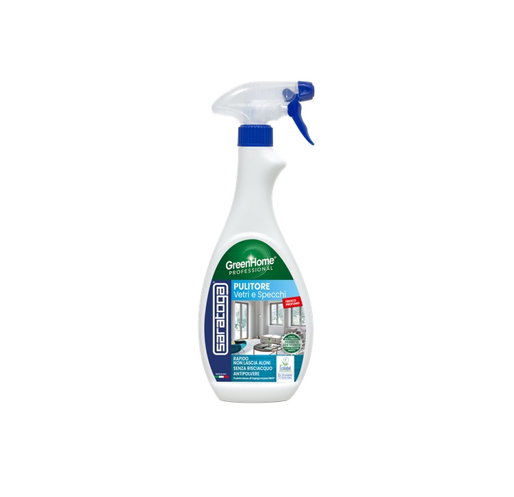 SARATOGA GreenHome Professional Vetri e Specchi è un liquido incolore a rapida asciugatura che non lascia aloni o impronte, non necessita di risciacquo e, grazie alle sue proprietà antistatiche, cattura polvere, tracce di smog, ditate e piccoli residui di sporco in genere, rallentandone la formazione e mantenendo a lungo la superficie trattata pulita, lucida e profumata.