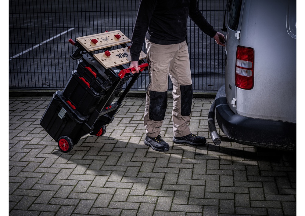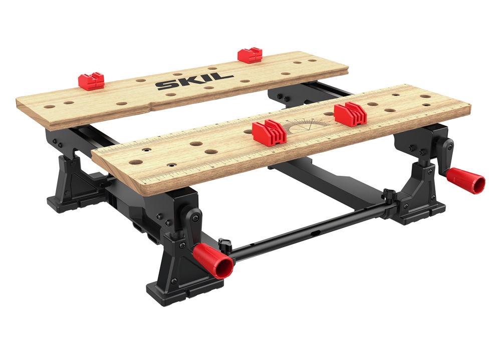 Il banco da lavoro SKIL modello 1290 AA può essere collegato in modo semplice e senza l’uso di utensili al supporto pieghevole SKIL (riferimento BT1E1301AA) e al sistema di valigie di stoccaggio mobile (riferimento 2610S01671), facilitando sia il trasporto sia lo stoccaggio compatto.
