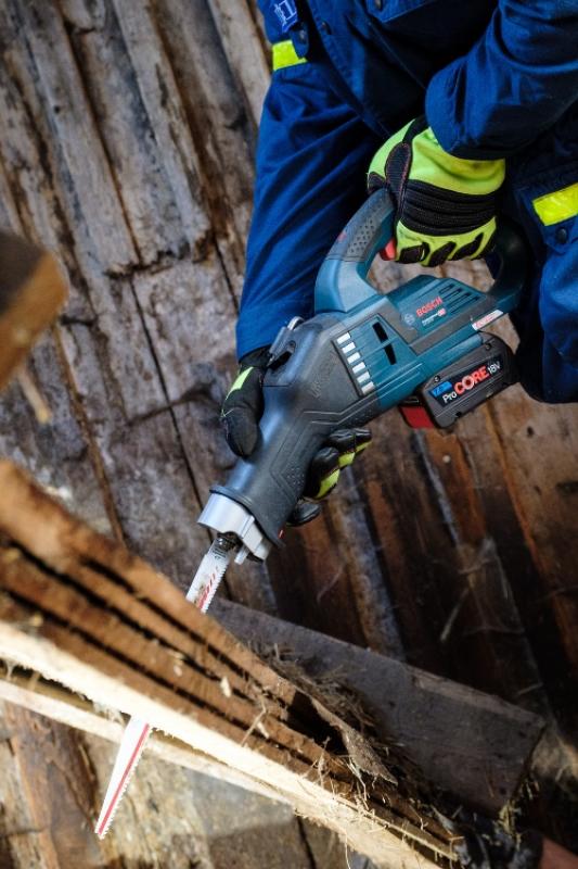 Sul campo, tutto deve svolgersi molto rapidamente: i vari compiti vengono assegnati in base a regole predefinite, come anche gli utensili da impiegare. Il GKW I è una sorta di cassetta degli attrezzi molto più grande. Nell’affrontare situazioni di caos utilizziamo davvero ogni tipo di utensile -ci spiega Peter Ebert, volontario della Protezione Civile, afferrando con sicurezza una sega universale a batteria GSA 18V-32 Professional, nella quale inserisce una batteria ad alte prestazioni ProCore 18V 7.0Ah-. Questa batteria offre circa il 90% di potenza in più rispetto ad una tradizionale batteria al litio da 18 Volt e 6,0 Ah, consentendo quindi un’efficienza decisamente maggiore. Un tale incremento di prestazioni si deve all’ulteriore miglioramento delle celle e alla netta riduzione delle resistenze interne. Inoltre, la batteria è particolarmente compatta, avendo dimensioni di circa il 30% inferiori rispetto ad analoghe batterie ad alte prestazioni e, grazie a tutto ciò, offre la massima densità energetica nella sua categoria. Con gli utensili a batteria guadagniamo tempo cruciale: non dobbiamo infatti posare reti di alimentazione e possiamo direttamente dirigerci dove si trova il ferito. In situazioni simili, utensili potenti e senza fili rappresentano un enorme vantaggio -spiega LarsWerthmann-. Detto, fatto: la squadra avanza sul posto. Poiché l’ingresso del fienile è bloccato da una controsoffittatura crollata, Lars opta per un primo accesso dall’alto, così da poter osservare la situazione all’interno. Per il volontario della Protezione Civile Antonio Lang, il compito è il seguente: salire sul tetto con l’equipaggiamento di protezione e la GSA 18V-32 Professional. Per interventi in posizioni di lavoro difficili, la sega universale a batteria è particolarmente indicata, grazie alla sua compattezza e all’impugnatura di nuova concezione che, contrariamente alla classica impugnatura chiusa, consente diverse posture della mano, che rendono più pratico afferrare e condurre l’utensile. Antonio racconta che l’impugnatura di questo utensile ci agevola notevolmente il lavoro; inoltre, le vibrazioni sono quasi inavvertibili. La GSA 18V-32 Professional è infatti dotata di un sistema attivo di ammortizzazione delle vibrazioni: un apposito contrappeso, alloggiato nella carcassa ingranaggi, che contrasta permanentemente le forze di massa. Una volta che l’utensile ha svolto il compito per Antonio Lang, il volontario lo passa al collega Peter Ebert. Quest’ultimo taglia dal basso gli elementi crollati, prima di passare alla prossima fase nella catena di salvataggio: ciò che resta della controsoffittatura va puntellato con una struttura in legno, in modo da mettere il ferito al sicuro.