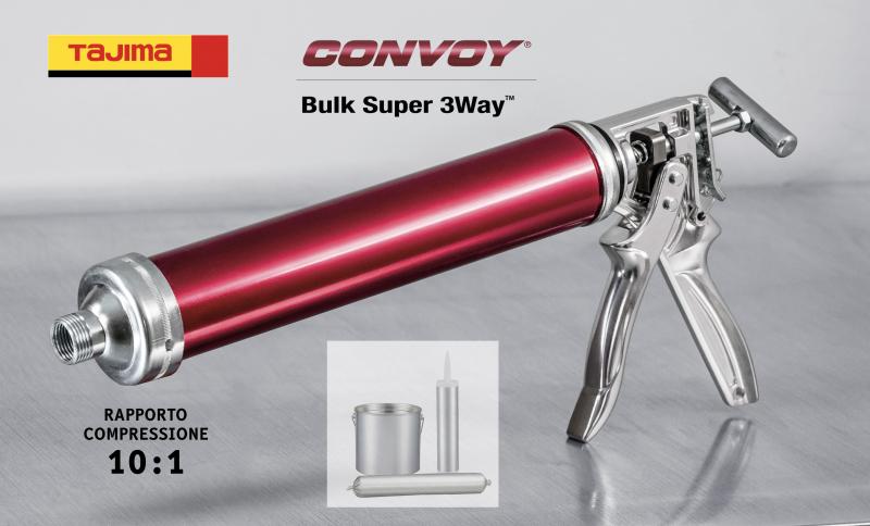 La terza novità riguarda le pistole per silicone. Con la pistola a ricarica universale Convoy Bulk Super 3Way - adattabile a sigillanti sfusi fino a 550 ml, salsicciotti fino a 400 ml e cartucce da 330 ml - Ullmann ha ampliato ancora la gamma di pistole della linea Convoy. Il cuore della Convoy Bulk Super 3Way è il sistema di sostituzione del pistone: basta premere il perno del pistone e ruotare, con un unico movimento semplice e veloce. Ma è l’insieme dei componenti e materiali con cui è realizzata a renderla unica: il corpo in alluminio, il grilletto e l’impugnatura in alluminio pressofuso, che garantiscono massima resistenza e grande leggerezza, il blocco premi stantuffo, azionabile con una sola mano, e il sistema anti-gocciolamento. Il risultato complessivo è infine garantito dalla perfetta sigillatura del pistone che impedisce perdite di materiale.