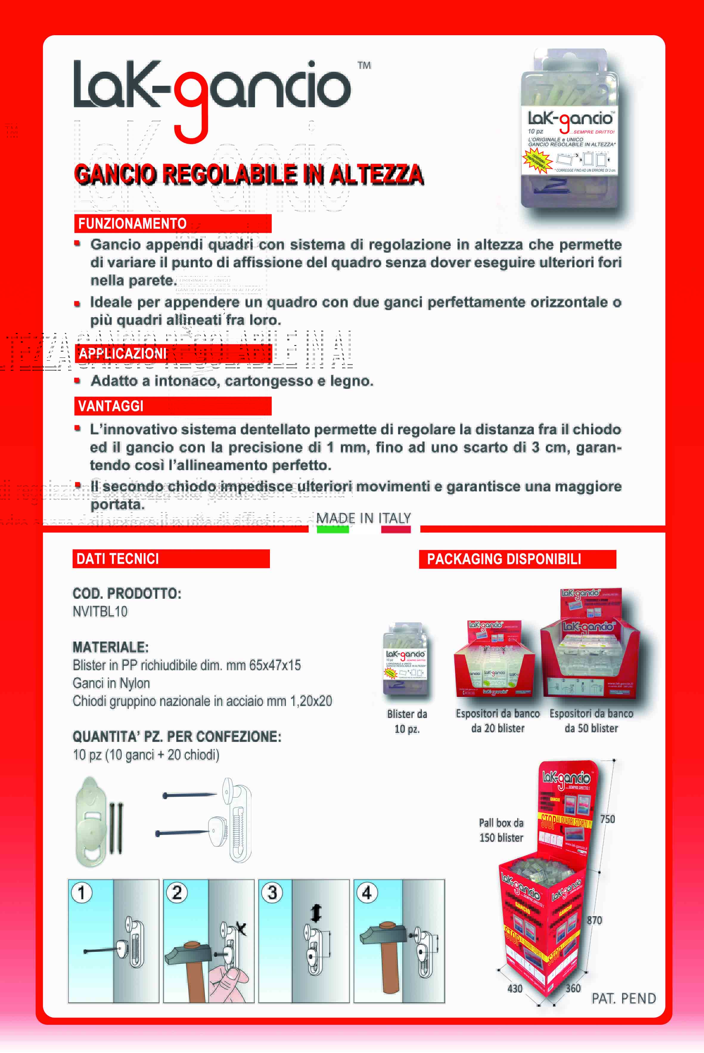 Lak-gancio è un prodotto brevettato Lakinnova e rappresenta la soluzione definitiva al problema di quadri e cornici storte, grazie al suo innovativo sistema dentellato permette di appendere un quadro con due ganci perfettamente orizzontale o più quadri allineati fra loro.